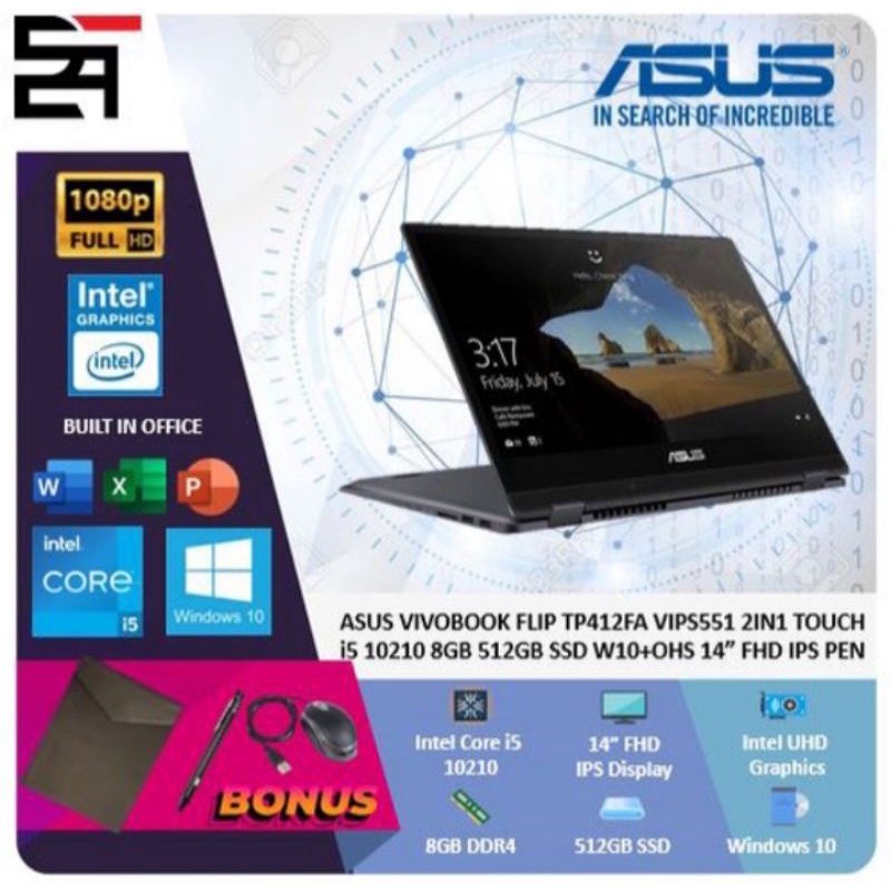 Saya Juga punya 4 Produk lain terkait Produk Laptop Asus Vivobook Flip TP412FA 2in1 Touch i5 10210 RAM 8 GB 512ssd W10 14 inc FHD Fingerprint yang perlu Anda lirik karena menarik, Produk itu adalah....